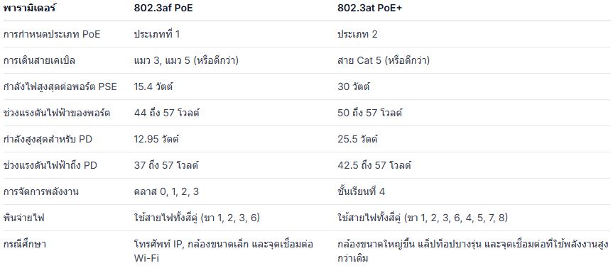 เรามาเปรียบเทียบมาตรฐาน 802.3af กับ 802.3at ในแง่ของพารามิเตอร์ต่างๆ เช่น กำลังไฟฟ้าสูงสุด แรงดันไฟฟ้า การเดินสาย และการจัดการพลังงานกัน