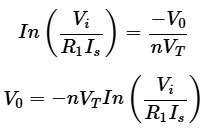 ดังนั้น วงจรขยายสัญญาณแบบผกผันลอการิทึมที่ใช้โอเปอเรชันแอมพลิฟายเออร์ที่กล่าวถึงข้างต้น จะสร้างเอาต์พุตที่เป็นสัดส่วนกับค่าผกผันลอการิทึมธรรมชาติ (เลขชี้กำลัง) ของแรงดันอินพุต Vi