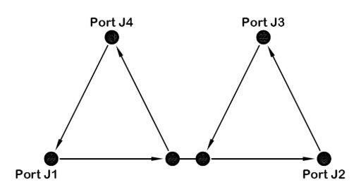 ในแผนผังด้านบนพลังงานไมโครเวฟจะถูกบังคับจากพอร์ต J1 ถึง J2 หรือจากพอร์ต J3 ไปยังพอร์ต J4 เมื่อข้ามทางแยกเฟอร์ไรต์สองจุด การแยกสูงจะใช้เฉพาะเมื่อข้ามจุดเชื่อมต่อเฟอร์ไรต์สองจุดที่นี่ระหว่างพอร์ต J2 และ J1 ที่มีพอร์ต J3 และ J4