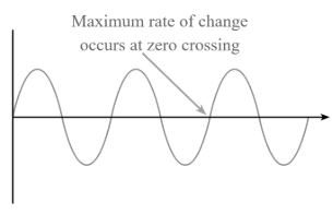 อัตราสูงสุดของการเปลี่ยนแปลงแรงดันไฟฟ้าเกิดขึ้นที่จุดข้ามศูนย์