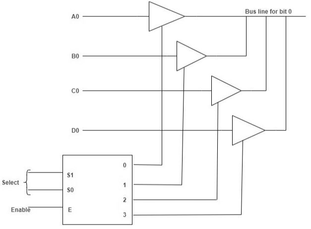 เพื่อให้ได้สายบัสเดียว จะต้องเชื่อมต่อเอาต์พุตของบัฟเฟอร์ทั้ง 4 ตัวเข้าด้วยกัน ตอนนี้อินพุตควบคุมจะตัดสินใจว่าอินพุตปกติทั้ง 4 ตัวใดจะสื่อสารกับสายบัส ตัวถอดรหัสใช้เพื่อให้แน่ใจว่ามีเพียงอินพุตควบคุมเดียวเท่านั้นที่ทำงานในแต่ละครั้ง แผนภาพของบัฟเฟอร์ 3 สถานะแสดงอยู่ด้านล่าง ภาพประกอบ - เส้นทางเดินรถโดยสารที่มีบัฟเฟอร์สามสถานะ