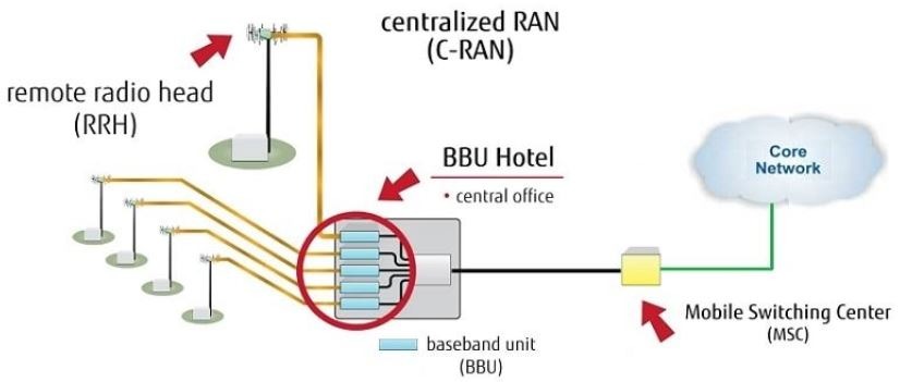 โรงแรมสำนักงานส่วนกลางหรือหน่วยเบสแบนด์ (BBU) ประกอบด้วยหน่วยเบสแบนด์หลายหน่วยที่ทำหน้าที่ประมวลผลแบบรวมศูนย์ สถานีควบคุมส่วนกลางนี้เชื่อมต่อกับเครือข่ายหลักโดยใช้การเชื่อมต่อใยแก้วนำแสงความเร็วสูง