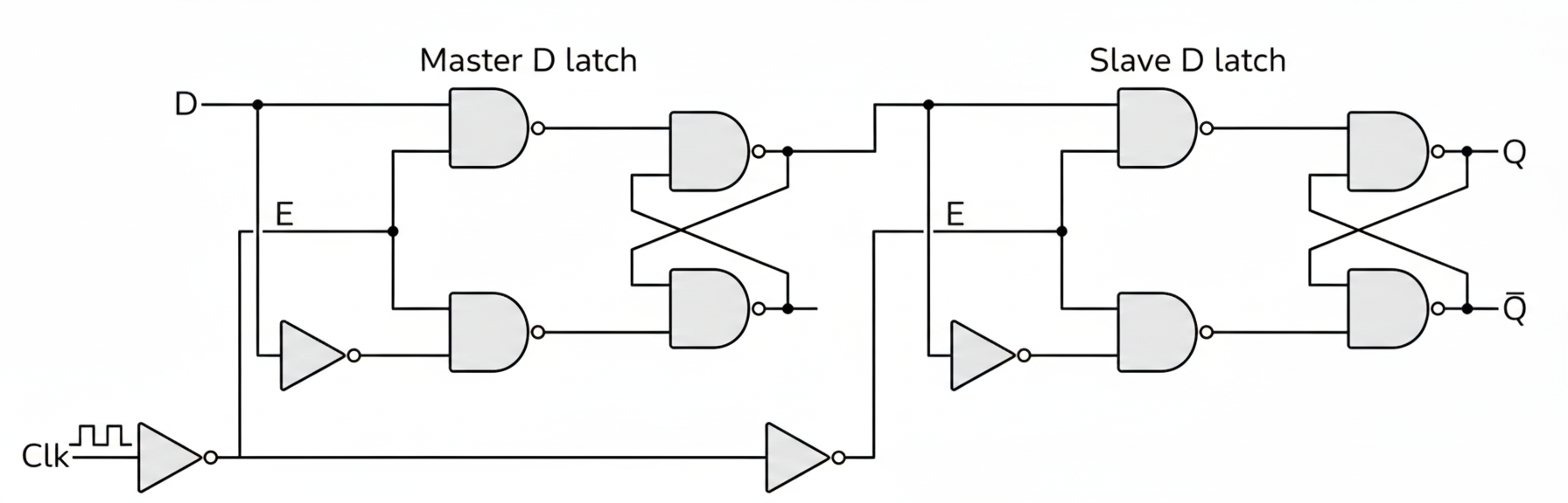 D Flip-Flop เป็นวงจรที่เปิดใช้งานด้วยขอบ ซึ่งรวมหมุด D คู่หนึ่งเพื่อจัดเก็บบิต มักใช้เป็นหน่วยการสร้างพื้นฐานในอุปกรณ์อิเล็กทรอนิกส์ดิจิทัลเพื่อสร้างตัวนับหรือบล็อกหน่วยความจํา เช่น การลงทะเบียนการแปล