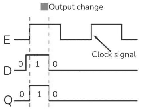 ในแถวแรกและแถวสุดท้ายของตารางความจริง อินพุตนาฬิกาคือ 0 และ 1 ไม่มีสัญญาณใดที่เป็นสัญญาณขอบ ดังนั้นจึงไม่มีอะไรเกิดขึ้น เอาต์พุต Q จะคงค่าเดิมไว้ ในกรณีนี้ไม่ว่าค่าของอินพุต D จะเป็นเท่าใดเอาต์พุต Q จะไม่เปลี่ยนแปลงมันจะยังคงเหมือนเดิม นี่คือวิธีที่วงจรนี้ "จดจํา" เล็กน้อย