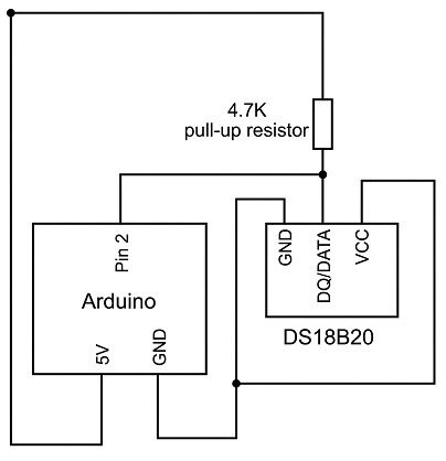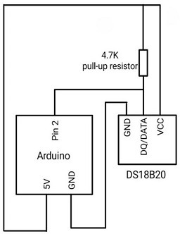 จากวงจรด้านบนพิน GND ของเซ็นเซอร์จะเชื่อมต่อกับพิน GND ของ Arduino UNO พิน DQ/DATA ของเซ็นเซอร์เชื่อมต่อกับพินดิจิตอล 2 ของ Arduino UNO เพื่อสร้างบัสสื่อสารแบบสายเดียว ตัวต้านทานแบบดึงขึ้นขนาด 4.7 กิโลโอห์มเชื่อมต่อจากเส้นทาง DQ/DATA ไปยังเส้นทาง VCC ของเซ็นเซอร์ DS18B20 และ Arduino เพื่อให้สามารถถ่ายโอนข้อมูลได้ สุดท้ายในการรับแหล่งจ่ายไฟพิน VCC ของเซ็นเซอร์จะเชื่อมต่อกับกราวด์ เนื่องจากทํางานในโหมดพลังงานปรสิต มันใช้อุปทานจากบรรทัดข้อมูล