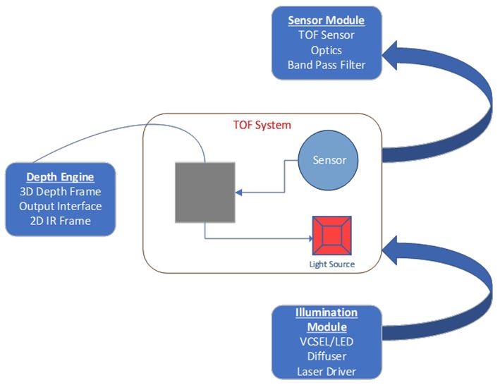 ภาพด้านล่างนี้แสดงให้เห็นถึงส่วนประกอบต่างๆ ในระบบกล้อง Time-of-Flight ได้เป็นอย่างดี: