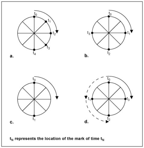 ทั้งสองสามารถมองว่าเป็นทิศทางที่ถูกต้อง ขึ้นอยู่กับว่าคุณ 'เห็น' ล้ออย่างไร แต่ตอนนี้เรามีสัญญาณ aliased นั่นคือมีองค์ประกอบความถี่ในระบบของเราที่ไม่ต้องการและเราไม่สามารถแยกแยะออกจากค่าจริงได้ ทั้งข้อมูลการเคลื่อนที่ไปข้างหน้าและย้อนกลับมีอยู่ เรามักจะเห็นองค์ประกอบย้อนกลับหรือ "sub-multiple" หรือ "image" ขององค์ประกอบไปข้างหน้า เนื่องจากองค์ประกอบไปข้างหน้าหลักจะสังเกตเห็นได้ยากเนื่องจากวิธีการที่การรวมกันของตา/สมองประมวลผลข้อมูล ข้อสังเกตที่น่าสนใจอีกประการหนึ่งคือ ณ จุดที่อัตราการสุ่มตัวอย่างเท่ากับอัตราการหมุนของล้อพอดี ข้อมูลที่ได้จะให้ข้อมูลที่เป็นประโยชน์น้อยมากเนื่องจากเครื่องหมายจะปรากฏที่จุดเดียวกันบนล้อเสมอ ในกรณีนี้เราไม่สามารถบอกได้ว่าล้อกำลังหมุนหรือหยุดนิ่ง