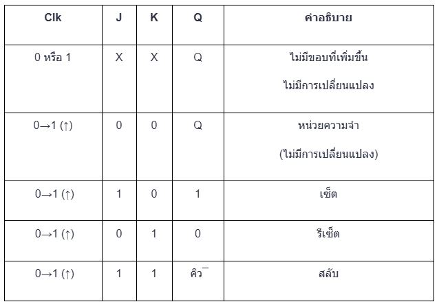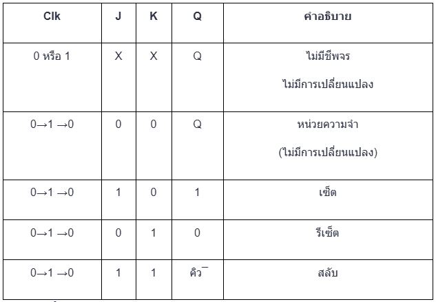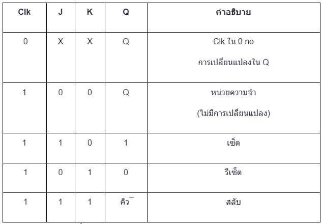 อินพุต J และ K ของฟลิปฟล็อป JK สามารถใช้เพื่อตั้งค่า รีเซ็ต หรือสลับเอาต์พุตได้ดังนี้: