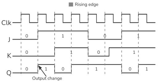 ภาพด้านบนแสดงให้เห็นว่าวงจรนี้ต้องการขอบที่เพิ่มขึ้นบนอินพุต Clk เพื่อเปลี่ยนสถานะของเอาต์พุต Q ได้อย่างไร และมันจะเปลี่ยนไปบนขอบที่เพิ่มขึ้นเท่านั้น
