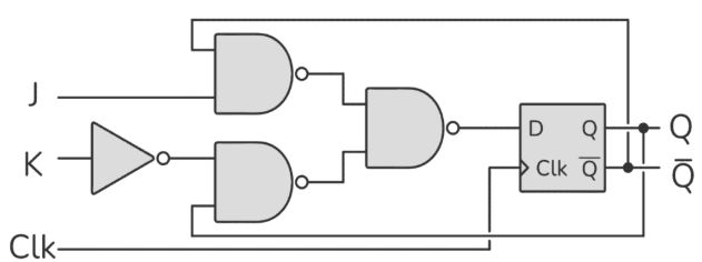 ในการสร้าง JK Flip-Flop ที่ทริกเกอร์เฉพาะกับสัญญาณขอบที่เพิ่มขึ้นคุณสามารถใช้ฟลิปฟล็อป D ที่ทริกเกอร์ขอบที่เพิ่มขึ้นเกต NOT และเกต NAND ดังนี้: