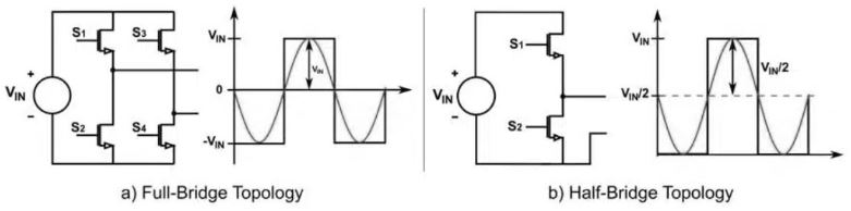 ความแตกต่างหลักระหว่างโทโพโลยีเหล่านี้อยู่ที่การสร้างรูปคลื่นเอาต์พุต โทโพโลยีแบบฟูลบริดจ์สร้างคลื่นสี่เหลี่ยมที่ไม่มีออฟเซ็ต DC และแอมพลิจูดเท่ากับแรงดันไฟฟ้าขาเข้า (VIN) ในทางกลับกันโทโพโลยีแบบฮาล์ฟบริดจ์สร้างคลื่นสี่เหลี่ยมจัตุรัสที่มีออฟเซ็ต DC เท่ากับ (VIN / 2) ส่งผลให้ครึ่งหนึ่งของแอมพลิจูดของคลื่นบริดจ์เต็ม
