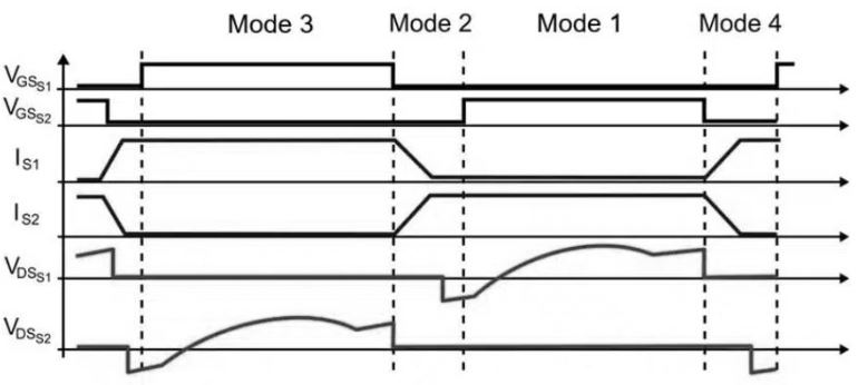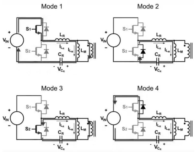 รูปที่ 7 แสดงโหมดการทํางานพื้นฐานสี่โหมดของตัวแปลง LLC โหมด 1 และ 3 แสดงถึงการดําเนินงานของ LLC ทั่วไป ซึ่งเราได้พูดคุยไปแล้ว ในโหมด 1 กระแสจะไหลจากแหล่งกําเนิดไปยังถังเรโซแนนซ์และทุติยภูมิของหม้อแปลง (Q1 เปิดอยู่ ในขณะที่ Q2 ปิดอยู่) ในทางกลับกันในโหมด 3 พลังงานที่เหลืออยู่ในถังเรโซแนนซ์จะถูกถ่ายโอนไปยังทุติยภูมิของหม้อแปลงโดยที่กระแสไหลไปในทิศทางตรงกันข้ามเมื่อเทียบกับโหมด 1 (Q1 ปิดและ Q2 เปิดอยู่) ZVS เกิดขึ้นระหว่างโหมด 2 และ 4 เมื่อปิดสวิตช์ทั้งสอง ในช่วงเวลาเหล่านี้กระแสจะไหลผ่านไดโอดของตัวทรานซิสเตอร์ (เช่น Q2 ในโหมด 2 หรือ Q1 ในโหมด 4) ซึ่งเรียกอีกอย่างว่าฟรีวีล