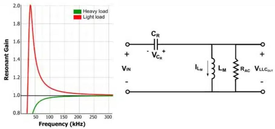 อัตราขยายของถังเรโซแนนซ์จะแตกต่างกันไปตามความถี่และโหลดที่ใช้กับด้านทุติยภูมิ (รูปที่ 4) นักออกแบบต้องปรับแต่งพารามิเตอร์เหล่านี้เพื่อให้แน่ใจว่าคอนเวอร์เตอร์ทํางานได้อย่างมีประสิทธิภาพในโหลดที่หลากหลายโดยการออกแบบอัตราขยายของถังให้เกิน 1 สําหรับค่าโหลดทั้งหมด