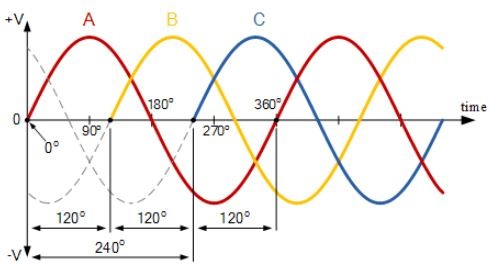แหล่งจ่ายไฟ 3 เฟสพัฒนาแนวคิดนี้ไปอีกขั้นโดยการรวมแรงดันไฟฟ้ากระแสสลับ 3 ตัวที่มีความถี่และแอมพลิจูดเท่ากัน โดยแต่ละแรงดันไฟฟ้ากระแสสลับเรียกว่า "เฟส" เฟสทั้งสามนี้มีเฟสต่างกัน 120 องศาทางไฟฟ้า ทำให้เกิดลำดับเฟสหรือการหมุนเฟสเป็น: 360 o ÷ 3 = 120 o ดังแสดงในภาพ
