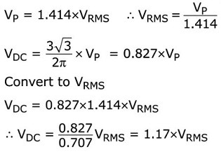 ดังนั้น แรงดันไฟฟ้ากระแสตรงเฉลี่ยของวงจรเรียงกระแสสามารถแสดงได้ในรูปของแรงดันไฟฟ้าเฟสรากกำลังสองเฉลี่ย (RMS) ดังนี้: