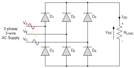 การแปลงกระแสไฟฟ้าสามเฟสเป็นกระแสสลับ โดยใช้ไดโอดหกตัวในวงจรบริดจ์ คือกระบวนการแปลงแหล่งจ่ายไฟกระแสสลับสามเฟสเพื่อใช้ในงานที่มีกำลังสูง