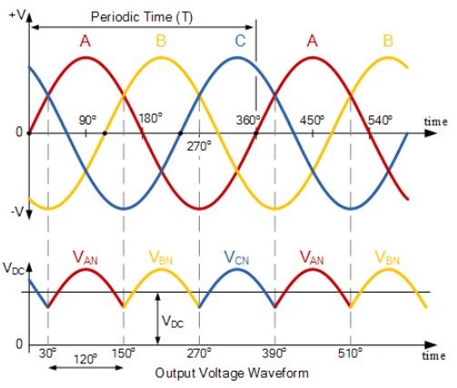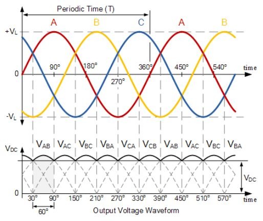 จากนั้นเราจะเห็นว่าสำหรับการแก้ไขกระแสไฟฟ้าแบบสามเฟสที่ไม่สามารถควบคุมได้ ไดโอดจะนำกระแสเป็นคู่ที่เข้ากัน โดยแต่ละเส้นทางการนำกระแสจะผ่านไดโอดสองตัวที่ต่ออนุกรมกัน ดังนั้นจึงต้องใช้ไดโอดเรียงกระแสทั้งหมดหกตัว โดยการสลับกระแสของวงจรจะเกิดขึ้นทุกๆ 60 o หรือหกครั้งต่อรอบ