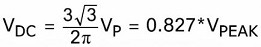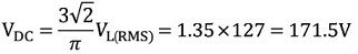 อีกครั้ง เราสามารถลดความซับซ้อนทางคณิตศาสตร์ลงได้เล็กน้อย โดยกล่าวอย่างถูกต้องว่า สำหรับค่าแรงดัน RMS ระหว่างสายที่กำหนด ในตัวอย่างของเราคือ 127 โวลต์ แรงดันเอาต์พุต DC เฉลี่ยจะเป็นดังนี้: