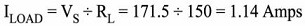 สัญญาณเอาต์พุตจากวงจรเรียงกระแสจะป้อนเข้าสู่โหลดความต้านทาน 150 โอห์ม จากนั้นเมื่อใช้กฎของโอห์ม กระแสโหลดจะเป็น: