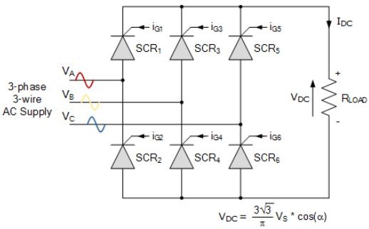 ตัวอย่างของวงจรเรียงกระแสแบบบริดจ์ 3 เฟสที่ควบคุมได้อย่างสมบูรณ์แสดงไว้ด้านล่าง: