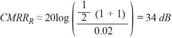 ที่ 34 เดซิเบล ค่า CMRR R ค่อนข้างต่ำ ในกรณีนี้ แม้ว่าเครื่องขยายเสียงจะมีค่า CMRR ที่ดีมาก แต่ก็ไม่สามารถให้ความแม่นยำสูงได้ เนื่องจากสายสัญญาณจะแข็งแรงเท่ากับจุดอ่อนที่สุดเสมอ ดังนั้น เพื่อวงจรวัดที่แม่นยำ ตัวต้านทานที่เลือกจะต้องมีความแม่นยำสูงมากเช่นกัน