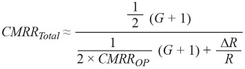 อย่างไรก็ตาม อัตราส่วนการปฏิเสธโหมดร่วมรวมของวงจรขยายเสียง (CMRR Total ) เกิดขึ้นจากการรวมกันของตัวต้านทาน CMRR R และอัตราส่วนการปฏิเสธโหมดร่วมของออปแอมป์ (CMRR OP ) สำหรับวงจรขยายเสียงแบบดิฟเฟอเรนเชียล คำนวณโดยใช้สมการที่ 3: