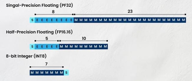 สำหรับการเรียนรู้เชิงลึกนั้น มีทั้งแบบความแม่นยำเดี่ยวหรือเต็มความแม่นยำ, Float32 และครึ่งความแม่นยำ ซึ่งหมายถึง Float16 และ BFloat16 โดยค่าเริ่มต้น จะใช้ความแม่นยำเต็มเพื่อฝึกฝนและจัดเก็บแบบจำลองการเรียนรู้เชิงลึก และการหาปริมาณโดยทั่วไปจะดำเนินการโดยการแปลงความแม่นยำเต็มเป็นรูปแบบ INT8 ดังนั้น การแทนค่า INT8 จึงมักถูกเรียกว่า "การควอนไทซ์"