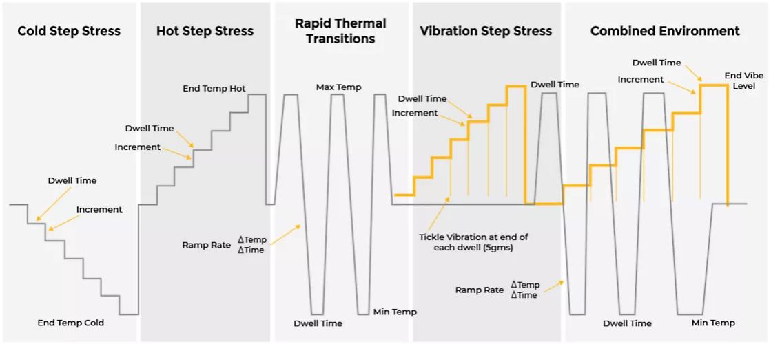 การสั่นสะเทือน อุณหภูมิสูง อุณหภูมิต่ำ การกำหนดขอบเขตแรงดันไฟฟ้า/ความถี่ การปั่นไฟ ความเครียดรวม (เช่น อุณหภูมิและการสั่นสะเทือน) การเลือกระดับความเค้นที่เหมาะสมขึ้นอยู่กับการใช้งานและสภาพแวดล้อมที่อุปกรณ์ทำงาน ส่วนที่สงสัยหรือบริเวณที่น่ากังวลภายในอุปกรณ์สามารถช่วยกำหนดระดับความเค้นที่จะใช้ในการทดสอบได้เช่นกัน