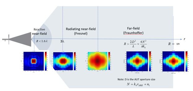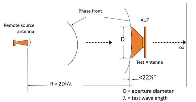 ในทางปฏิบัติ สนามแม่เหล็กไฟฟ้าของเสาอากาศที่แผ่รังสีในพื้นที่ 3 มิติ สามารถแสดงได้ด้วยหน้าคลื่นทรงกลมเมื่อจุดสังเกตอยู่ห่างจากแหล่งกำเนิดมากพอ ที่ระยะห่างมากจากเสาอากาศแหล่งกำเนิด ความโค้งของหน้าคลื่นจะมีค่าน้อยที่ช่องรับแสงของเสาอากาศที่กำลังทดสอบ (AUT) และจะใกล้เคียงกับคลื่นระนาบสม่ำเสมอ หากระยะห่างจากแหล่งกำเนิดเท่ากับหรือมากกว่าขอบเขตด้านในของบริเวณสนามไกลของแหล่งกำเนิด Rmin > 2D2max/l แล้ว ความแตกต่างของเฟสสูงสุดระหว่างสนามตกกระทบจริงและการประมาณค่าในโซนไกลจะไม่เกิน 22.5 องศา (นั่นคือ