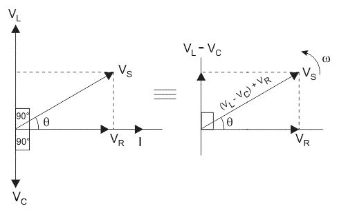 แรงดันไฟฟ้าทั้งหมดในวงจร RLC ไม่เท่ากับผลรวมพีชคณิตของแรงดันไฟฟ้าข้ามตัวต้านทานตัวเหนี่ยวนําและตัวเก็บประจุแต่เป็นผลรวมเวกเตอร์เพราะในกรณีของตัวต้านทานแรงดันไฟฟ้าจะอยู่ในเฟสกับกระแสสําหรับตัวเหนี่ยวนําแรงดันไฟฟ้านํากระแส 90o และสําหรับตัวเก็บประจุแรงดันไฟฟ้าจะล่าช้ากว่ากระแส 90o (ตาม ELI the ICE Man)