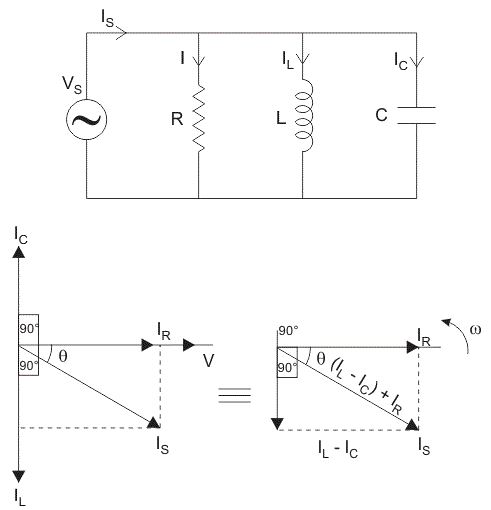 ในวงจร RLC แบบขนานส่วนประกอบทั้งหมดจะเชื่อมต่อแบบขนานดังนั้นแรงดันไฟฟ้าในแต่ละองค์ประกอบจึงเท่ากันดังนั้นสําหรับการวาดแผนภาพเฟสเซอร์ให้ใช้แรงดันไฟฟ้าเป็นเวกเตอร์อ้างอิงและกระแสอื่น ๆ ทั้งหมดเช่น IR, ICIC, IL จะถูกวาดสัมพันธ์กับเวกเตอร์แรงดันไฟฟ้านี้กระแสผ่านแต่ละองค์ประกอบสามารถพบได้โดยใช้กฎปัจจุบันของ Kirchhoff ซึ่งระบุว่าผลรวมของกระแสที่เข้าสู่ทางแยกหรือโหนดเท่ากับผลรวมของกระแสที่ออกจากโหนดนั้น