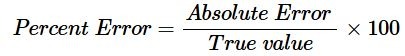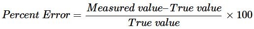 ดังที่กล่าวไว้ก่อนหน้านี้ เราไม่สามารถวัดค่าที่แท้จริงได้ในความเป็นจริง ดังนั้นแทนที่จะใช้ค่าที่แท้จริง เราจึงใช้ค่าเฉลี่ยในการคำนวณเปอร์เซ็นต์ความคลาดเคลื่อน ดังนั้นสูตรเปอร์เซ็นต์ความคลาดเคลื่อนจึงเป็นดังนี้
