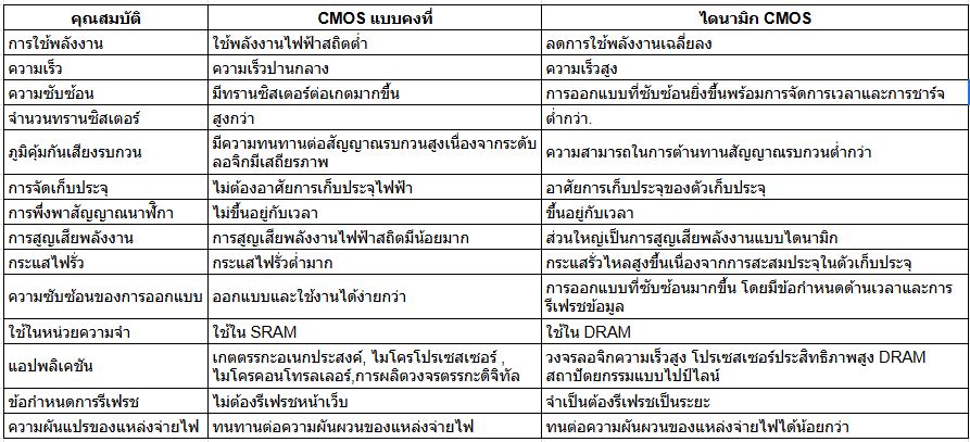 ไดนามิก CMOS ความแตกต่าง ระหว่าง CMOS แบบคงที่และ CMOS แบบไดนามิกสรุป CMOS แบบสแตติกเป็นวงจรผสมที่มีทั้งวงจรดึงขึ้น (PUN) และวงจรดึงลง (PDN) CMOS แบบสแตติกใช้เฉพาะในการออกแบบวงจรรวมระดับสูง CMOS แบบสแตติกใช้พลังงานต่ำและให้ประสิทธิภาพที่เชื่อถือได้ในระบบ CMOS แบบไดนามิกเป็นวงจรดิจิทัล มีสัญญาณนาฬิกาเดียว ช่วยให้ระบบทำการชาร์จล่วงหน้าและประเมินผล ตัวเก็บประจุ CMOS แบบไดนามิกสามารถสร้างประสิทธิภาพกระแสสูงด้วยการใช้พลังงานต่ำ รีเลย์ CMOS แบบไดนามิกให้พลังงานอย่างต่อเนื่องเพื่อรักษาการทำงานทั้งหมด CMOS แบบสแตติกใช้พลังงานในระหว่างการสวิตช์ ยกเว้นในส่วนนี้แล้ว CMOS แบบสแตติกไม่ใช้พลังงานเลย ไม่มีเส้นทางตรงไปยังกราวด์ใน CMOS แบบสแตติก CMOS แบบไดนามิกสามารถทำการสวิตช์ได้เร็วกว่า