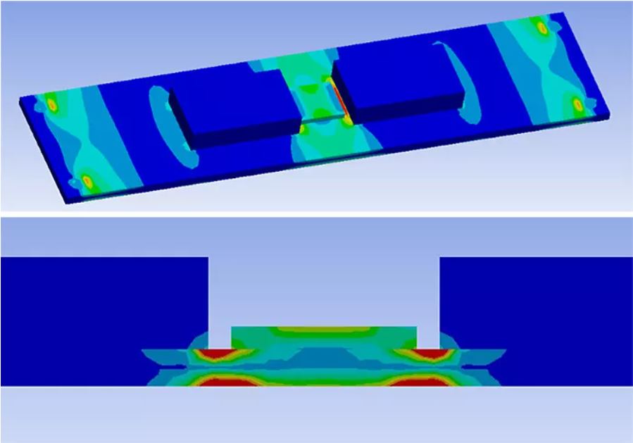ในรูปที่ 2 มีการวาง QFN ไว้ระหว่างตัวเหนี่ยวนำขนาดใหญ่สองตัวบน แผงวงจรพิมพ์ (PCB) ที่มีสแตนด์ออฟสี่มุม ระหว่างเหตุการณ์วงจรความร้อน คุณจะเห็นพื้นที่ความเครียดสูง (แสดงด้วยสีแดงและสีเหลือง) ที่เกิดขึ้น การวาง QFN ไว้ในพื้นที่ความเครียดสูงที่เกิดขึ้นอาจทำให้จุดบัดกรีของ QFN เสียหายได้