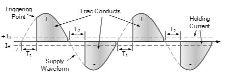 จากนั้นค่าเฉลี่ยของกระแสหลอดไฟจะแปรผันโดยการเปลี่ยนเวลาหน่วง T ระหว่างจุดเริ่มต้นของรอบและจุดทริกเกอร์ วิธีนี้เรียกกันทั่วไปว่า "การควบคุมเฟส"