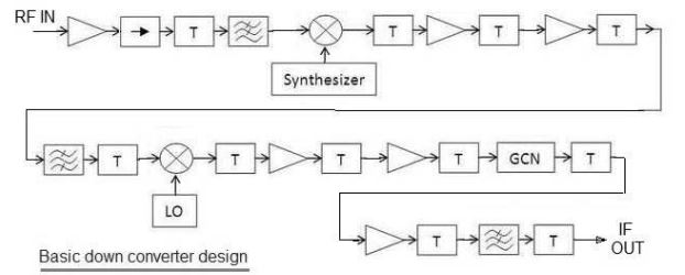 รูปที่ 4 แสดงแผนภาพเส้นพื้นฐานของตัวแปลงดาวน์ที่ใช้สําหรับความถี่ย่านความถี่ C การออกแบบขึ้นอยู่กับสถาปัตยกรรมเฮเทอโรไดน์ตามที่อธิบายไว้ข้างต้นในห่วงโซ่การแปลงขึ้น