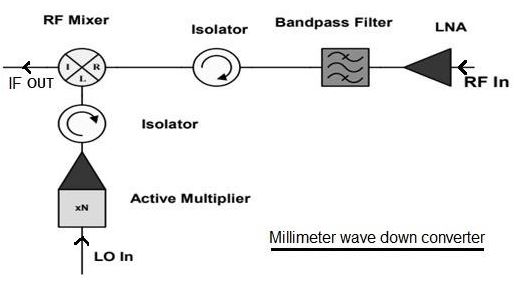 รูปที่ 3 แสดงการออกแบบตัวแปลงคลื่นขึ้นมิลลิเมตร ใช้เครื่องผสมเดียวสําหรับการแปลง RF ขึ้น ความถี่ LO จะถูกคูณและส่งผ่านไปยังเครื่องผสม RF เป็นอินพุตเพื่อเอาชนะด้วยอินพุต IF เอาต์พุตมิกเซอร์ RF จะถูกส่งผ่านตัวแยกและ BPF ก่อนที่จะถูก amplified โดย PA (Power Amplifier) ใช้ตัวแยกอีกหนึ่งตัวหลังจากตัวคูณตามที่แสดงเพื่อหลีกเลี่ยงการสะท้อนของสัญญาณ LO กลับ