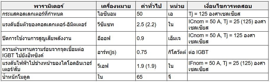 กระแสคอลเลกเตอร์ที่กำหนด (ICnom) คือ 50 Aและได้รับการออกแบบมาสำหรับ แพลตฟอร์มแรงดันไฟฟ้า650 V