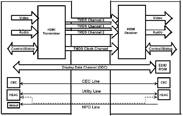 แผนภาพบล็อกโปรโตคอล HDMI สายเคเบิลและขั้วต่อ