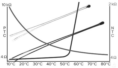 รูปที่ 2 แสดงลักษณะทั่วไปของเทอร์มิสเตอร์ NTC (สีน้ําเงิน) และ PTC (สีแดง) โดยปกติค่าความต้านทานจะแสดงในระดับลอการิทึม แต่เพื่อแสดงให้เห็นถึง 'เข่า' ที่แหลมคมของเส้นโค้งเมื่อ PTC ร้อนขึ้นเส้นโค้งตัวแทนได้ถูกดึงมาจากผลการทดสอบกับเทอร์มิสเตอร์จริง ความต้านทานของเทอร์มิสเตอร์ PTC อยู่ที่ 4 Ω ที่อุณหภูมิห้อง แต่จะเพิ่มขึ้นอย่างรวดเร็วเมื่ออุณหภูมิสูงกว่าประมาณ 50 องศาเซลเซียส ในทางกลับกันเทอร์มิสเตอร์ NTC มีความต้านทานสูงที่อุณหภูมิต่ําและลดลงในลักษณะที่ไม่เป็นเชิงเส้นเมื่ออุณหภูมิสูงขึ้น