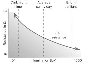 ตัวต้านทานที่ขึ้นกับแสง (LDR) ใช้เพื่อตรวจจับระดับแสง เช่น ในเซลล์ PE (โฟโตอิเล็กทริก) บนเสาไฟฟ้า เพื่อเปิดและปิดไฟถนน หรือเพื่อควบคุมแสงกลางคืนอื่นๆ เมื่อแสงตกกระทบตัวต้านทานความต้านทานจะเปลี่ยนไปและความรู้สึกของวงจรอิเล็กทรอนิกส์จะเปลี่ยนไปเพื่อเปิดหรือปิดรีเลย์หรือสวิตช์โซลิดสเตต รูปที่ 6 แสดงความสัมพันธ์ระหว่างความต้านทานและการส่องสว่างใน LDR