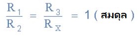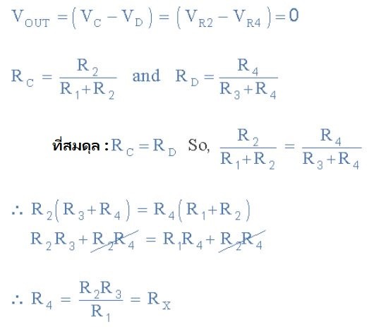 สมการวงจรบริดจ์วีทสโตนที่จำเป็นในการหาค่าความต้านทานที่ไม่ทราบค่า RX ณ สภาวะสมดุล มีดังนี้: