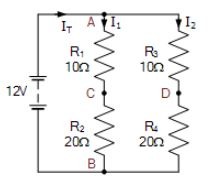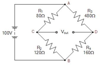 วงจรบริดจ์วีทสโตนที่ไม่สมดุลต่อไปนี้ถูกสร้างขึ้น จงคำนวณแรงดันเอาต์พุตที่จุด C และ D และค่าของตัวต้านทาน R4 ที่จำเป็นในการทำให้วงจรบริดจ์สมดุล