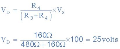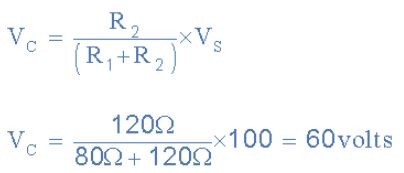 แรงดันไฟฟ้าที่จุด C ซึ่งก็คือแรงดันตกคร่อมตัวต้านทานล่าง R2 นั้น คำนวณได้ดังนี้: