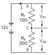 จากนั้นเราจะเห็นว่าแรงดันไฟต้นทาง VS ถูกแบ่งระหว่างตัวต้านทานอนุกรมสองตัวตามสัดส่วนโดยตรงของค่าความต้านทาน โดยที่ VR1 = 4V และ VR2 = 8V