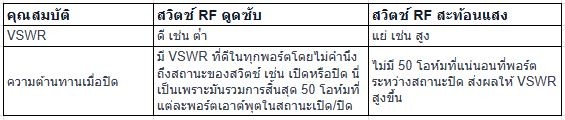ตารางต่อไปนี้เน้นการเปรียบเทียบที่สําคัญระหว่างสวิตช์ดูดซับและสะท้อนแสงที่ใช้ในโดเมน RF และไมโครเวฟ