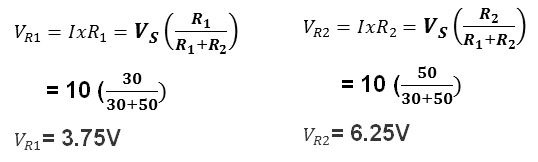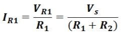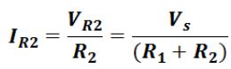 ในตัวแบ่งแรงดันไฟฟ้าแรงดันขาออกจะลดแรงดันไฟฟ้าขาเข้าและกระแสที่ไหลผ่านเครือข่ายอนุกรมที่สามารถคํานวณได้โดยใช้กฎของโอห์ม I = V / R เนื่องจากกระแสเป็นเรื่องปกติของตัวต้านทานทั้งสองกระแสข้ามตัวต้านทานจึงเท่ากัน เราสามารถคํานวณแรงดันไฟฟ้าที่ตกผ่านตัวต้านทาน R2 โดยใช้สมการนี้: