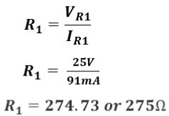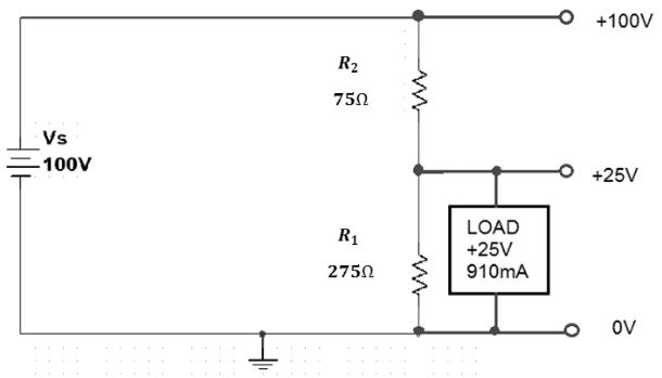 ข้อกําหนดสําหรับตัวแบ่งแรงดันไฟฟ้านี้คือการให้แรงดันไฟฟ้า 25V และกระแสไฟ 910 mA ให้กับโหลดจากแรงดันไฟฟ้าต้นทาง 100V
