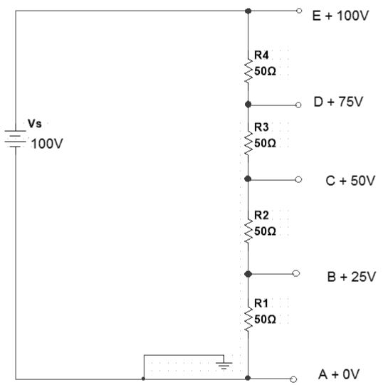 บันไดแรงดันไฟฟ้าเป็นวงจรที่ประกอบด้วยตัวต้านทานหลายตัวในอนุกรมโดยมีแรงดันไฟฟ้าที่วางอยู่ทั่วเครือข่ายตัวต้านทานทั้งหมด ตัวต้านทานแต่ละตัวในเครือข่ายมีแรงดันไฟฟ้าตกสูงกว่าตัวก่อนหน้า เนื่องจากตัวต้านทานในบันไดเป็นอนุกรมกระแสจึงเท่ากันตลอด เพื่อให้ได้ค่าคุณควรหารแรงดันไฟฟ้าทั้งหมดด้วยความต้านทานทั้งหมด แรงดันไฟฟ้าตกคร่อมในตัวต้านทานแต่ละตัวสามารถคํานวณได้โดยการคูณกระแสรวมด้วยค่าของตัวต้านทานแต่ละตัว แรงดันไฟฟ้าที่อ้างอิงถึงกราวด์ที่โหนดใด ๆ สามารถกําหนดได้ว่าเป็นผลรวมของแรงดันไฟฟ้าที่ลดลงโดยตัวต้านทานแต่ละตัวระหว่างโหนดนั้นและกราวด์