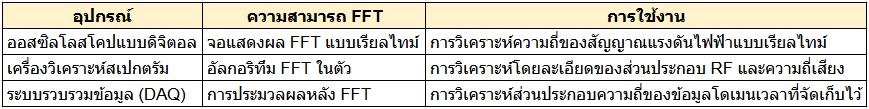 FFT เป็นเครื่องมืออันทรงพลังที่ผสานรวมเข้ากับเครื่องมือทดสอบสมัยใหม่มากมาย เช่น ออสซิลโลสโคป เครื่องวิเคราะห์สเปกตรัม และระบบเก็บข้อมูล ด้วยการแปลงสัญญาณโดเมนเวลาเป็นโดเมนความถี่ FFT ช่วยให้คุณสามารถแสดงภาพและวิเคราะห์องค์ประกอบความถี่ของสัญญาณแบบเรียลไทม์ ทำให้การวินิจฉัยและแก้ไขปัญหาที่ซับซ้อนง่ายขึ้น